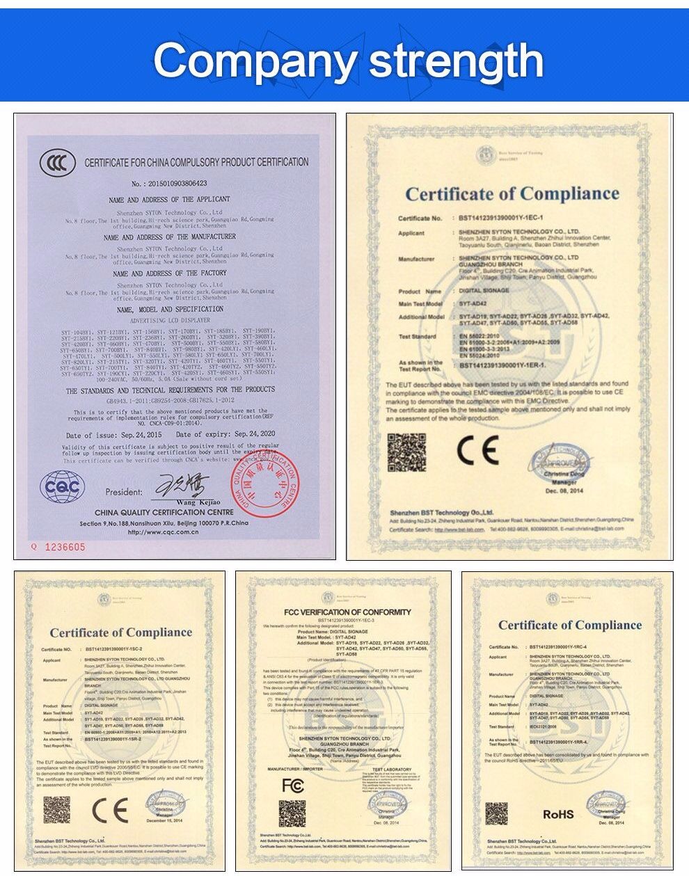 We provide OEM and ODM service. We have sales team, product team, technical supprot team, quality control team and R&D department to keep developing new products and meet customers’ personal requests, such as appearance design, high brightness requirement, AR anti-glare etc. Every Digital Signage from SYTON gets passed strict quality inspection. Our products have been passed CE,RoHs,FCC Certification.