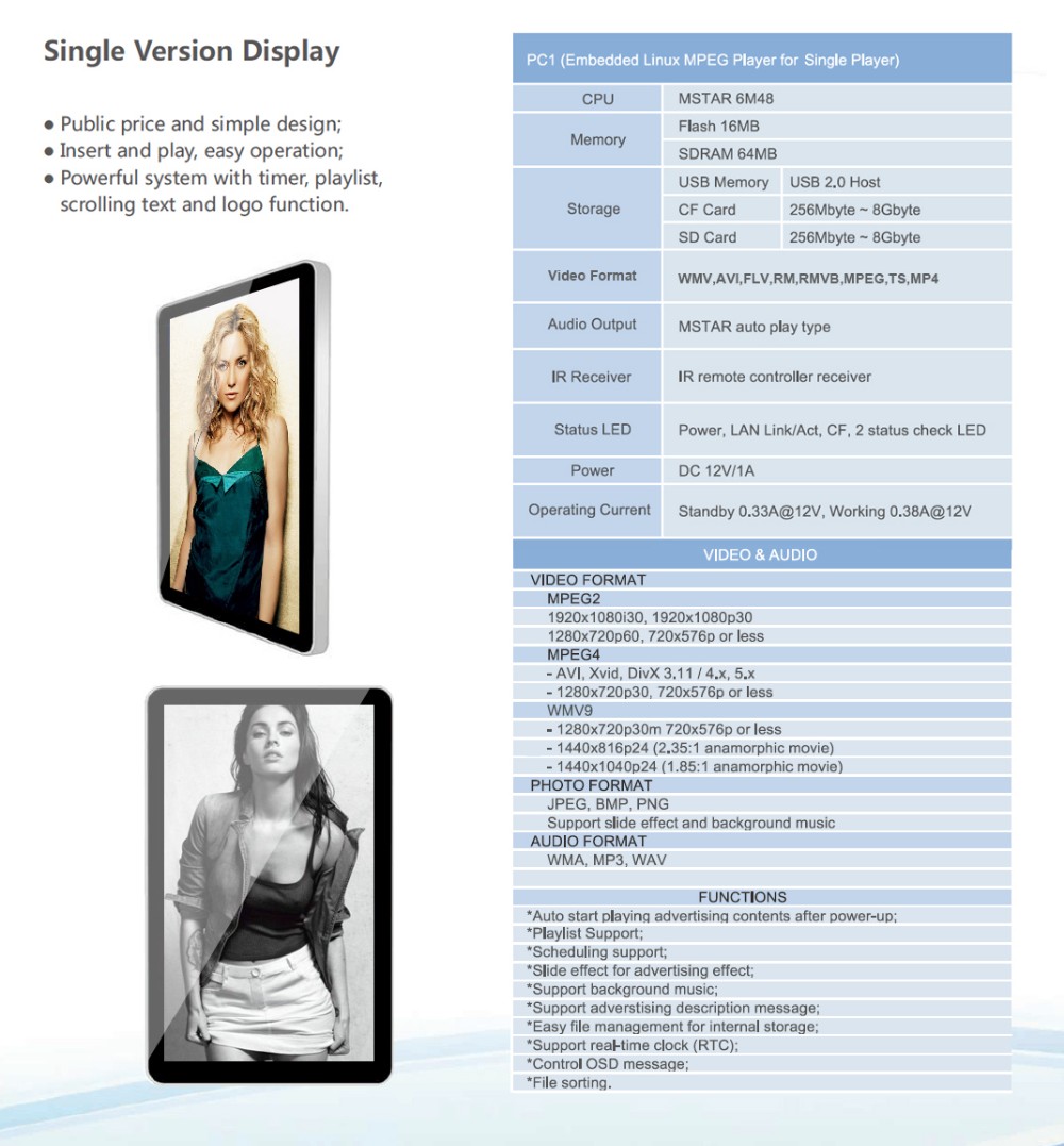 | Advanced functions: | Support play log, customer logo | ||||||||