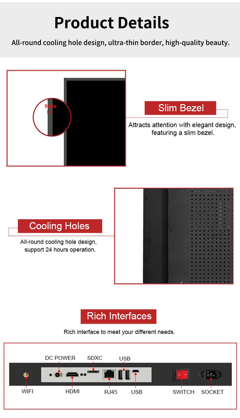 Floor standing series is commercial grade LCD screen technology with Android OS or Windows OS. They are widely used in public environments, including airport, hotel, Bank, Metro station.