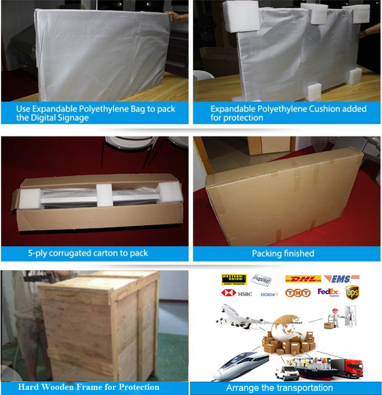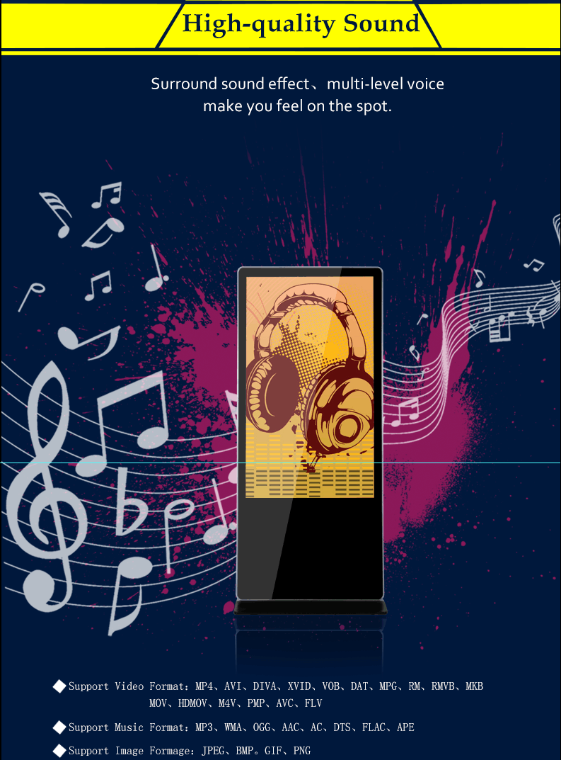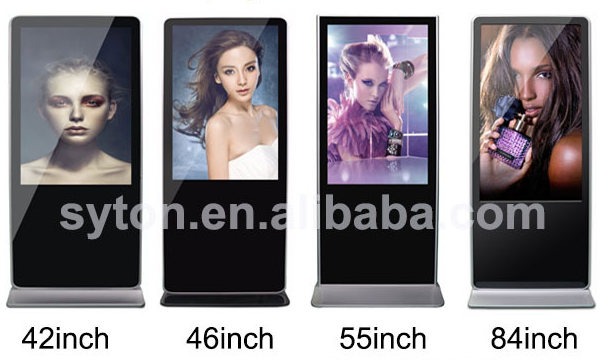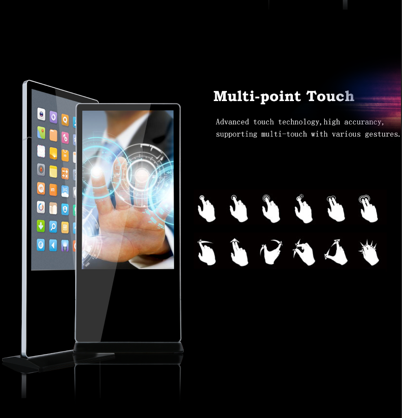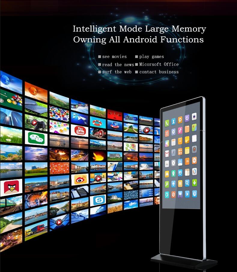 This type Android advertising player can connect wifi and download Apps ,pictures,films or videos on the internet. If without wifi, the floor standing digital signage can be shifted into standalone version, and it can display the content in your USB or SD card. The indoor LCD multimedia player is FULL HD and has 1080P resolution, and adapt grade A original panel, only 3.5cm. And the LCD kiosk also support split screen, different area display different content.We have our own information releasing system, you can use one central monitor to control the others.