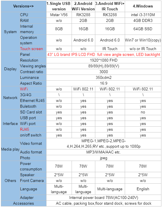 | Android Network version | Quad core 8G internal memory,,VGA input,USB,SD slot,WIFI,LAN,3G/4G optional |